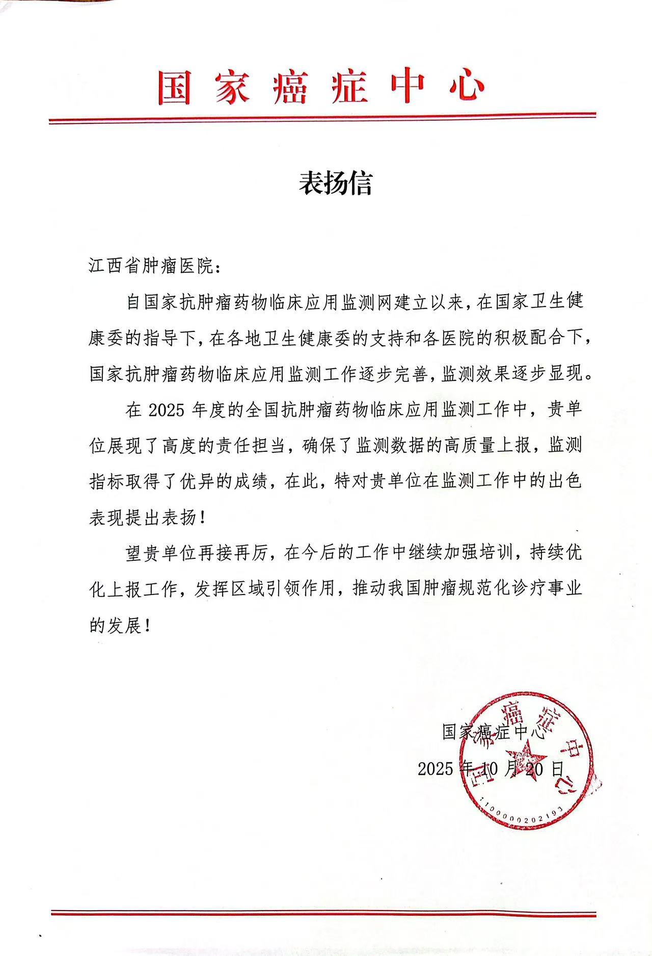 近日,第十二届国家癌症中心学术年会第三轮会议在京召开。会上,国家癌症中心对全国抗肿瘤药物临床应用监测工作中表现突出的单位予以表彰。江西省肿瘤医院因在数据上报的及时性、完整性与准确性方面表现卓越,荣获国家癌症中心通报表扬,充分彰显了该院在肿瘤规范化诊疗及精细化管理方面的坚实基础。