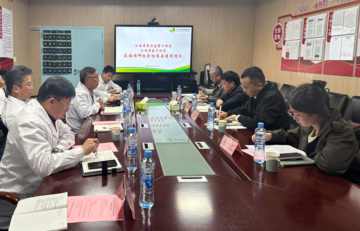 (付德顺报道)11月17日下午,江西省药品监督管理局二级巡视员朱宗华、省医疗保障局二级调研员徐立平及省药品监督管理局药品经营处处长徐匡根一行,赴江西省肿瘤医院就获批第四类放射性药品使用许可证后的放射性药品研发与临床使用情况进行专题调研。江西省肿瘤医院院长何亦斌,副院长陈志军、宋荣峰及相关科室负责人参加了此次调研。