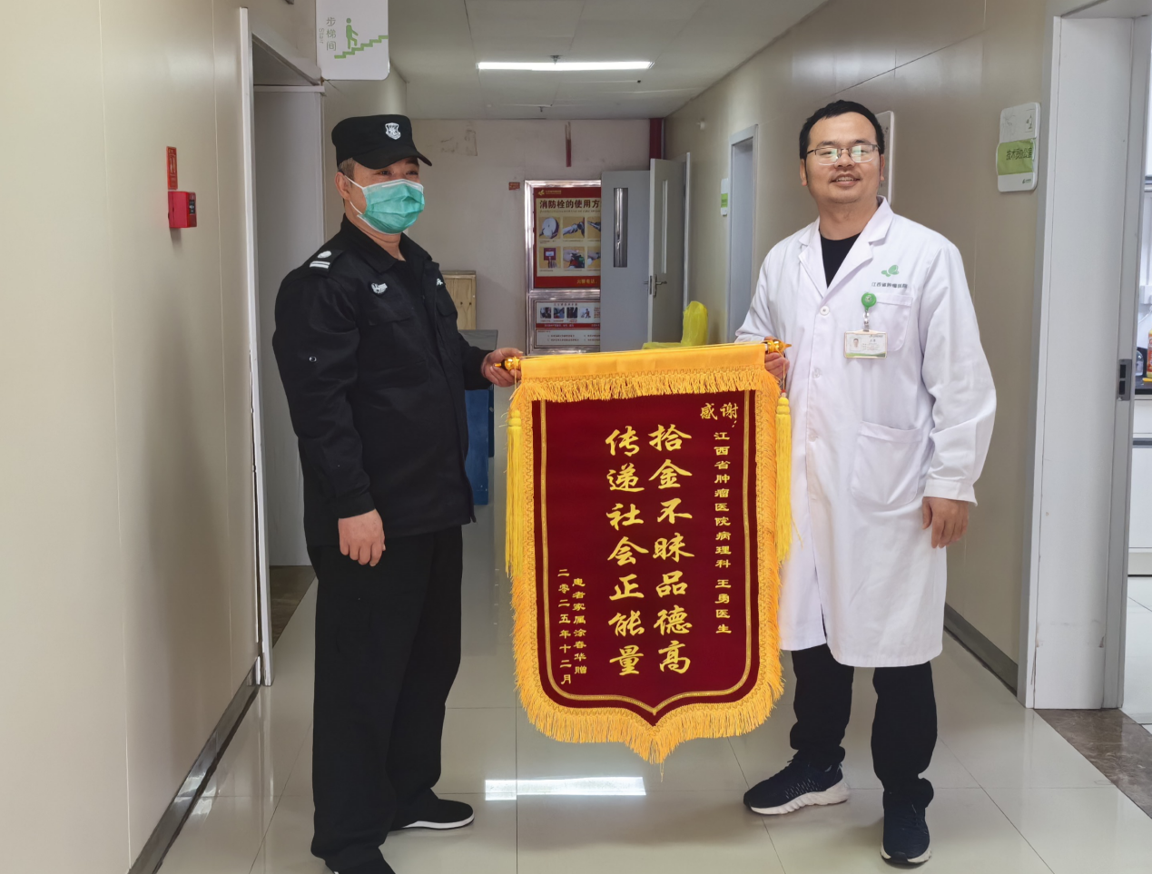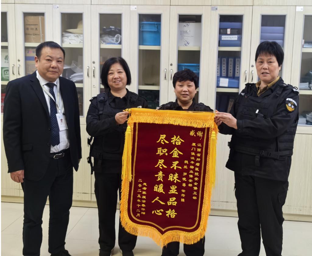 12月8日,市民涂女士到安全保卫部反映,其家属在做完PET-CT检查后遗失一枚金戒指,申请调阅监控查找。工作人员要求涂女士提供戒指相关凭证,经仔细核对,确认该戒指正是其家属遗失之物。涂女士介绍,此戒指为其爱人母亲所赠,意义非凡。金戒指失而复得后,涂女士深表感激,特意制作两面锦旗,分别赠予王勇及安全保卫部、物业保安部,以表谢意。