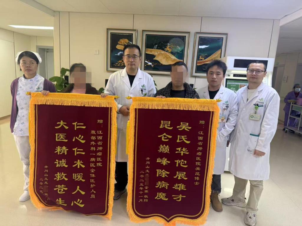 这两面锦旗,不仅承载着一位患者重获新生的感激,更象征着井冈山老区人民与江西省肿瘤医院之间以生命相托的深厚情谊。从昔日挂职干部在基层播撒健康火种,到今日百姓跨越百里的生命托付;从跨院协作的科学施治,到手术台上的创新突破,这是一场关于信任、协作与精湛医术的生动实践。
