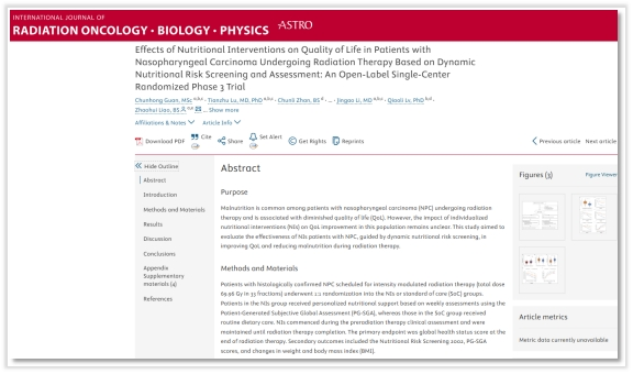 在此背景下,该院研究团队开展了一项前瞻性的临床研究,首次在中国患者人群中证实:基于动态营养风险筛查与综合营养评估、由多学科团队共同实施的个体化营养干预,可显著提升鼻咽癌患者放疗期间的生活质量与营养状况。这一成果标志着该院在肿瘤支持治疗与跨学科协作方面取得了重要突破。