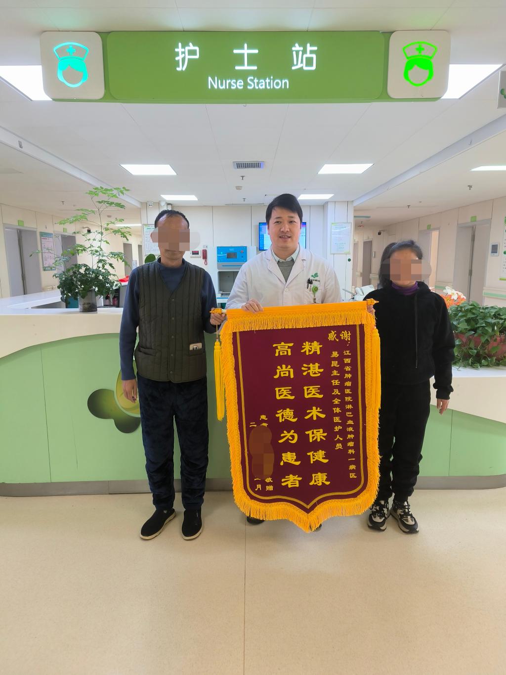 (徐胜华报道)1月12日,在江西省肿瘤医院淋巴血液肿瘤科一病区,来自修水县的患者车先生及其配偶向易昆副主任医师赠送了一面写有“精湛医术保健康,高尚医德为患者”的锦旗,并深深鞠躬以表达救命之恩的感激之情。