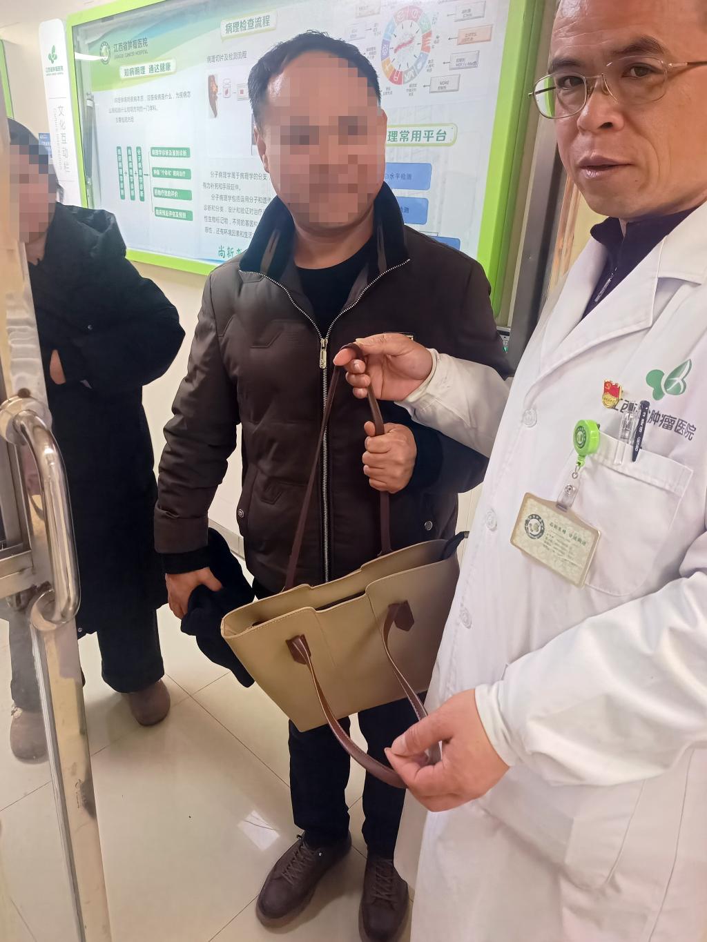 (傅爱荣报道,黄传生审核)2月24日(农历正月初八)春节假期后的首个工作日,上午10时许,正值医院就诊高峰期,人来人往的病理科门前上演了暖心一幕。医学病理科医生傅爱荣在途经科室走廊时,发现桌子上放着一个米黄色的背包,打开一看,里面竟是一叠厚厚的现金,以及患者的病历资料和身份证明。