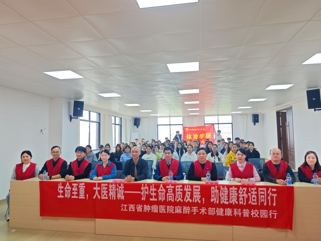 (熊星星报道,肖华平审核)自2017年起,每年3月的最后一周被定为中国麻醉周。今年是第十届“中国麻醉周”,主题为“生命至重,大医精诚——护生命高质发展 助健康舒适同行”。3月28日,江西省肿瘤医院麻醉手术室团队走进江西师范大学体育学院,围绕运动安全、麻醉常识及应急急救技能,为体育专业师生带来了一场贴近实战的科普培训。