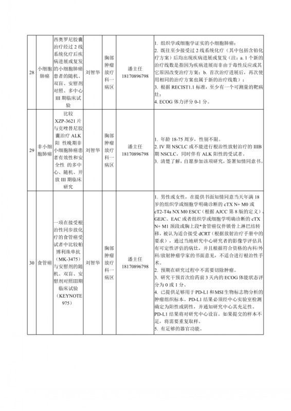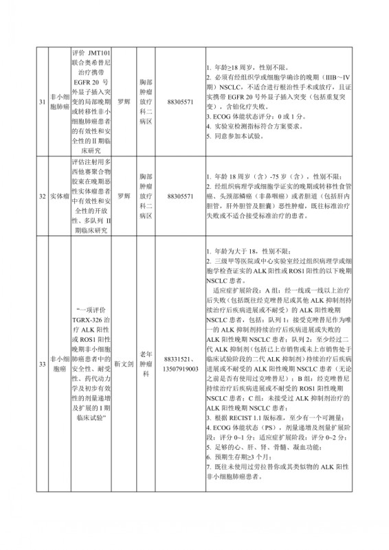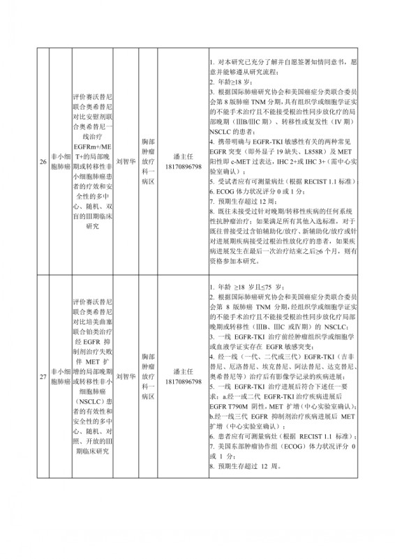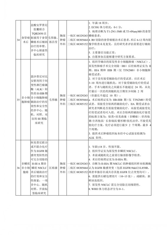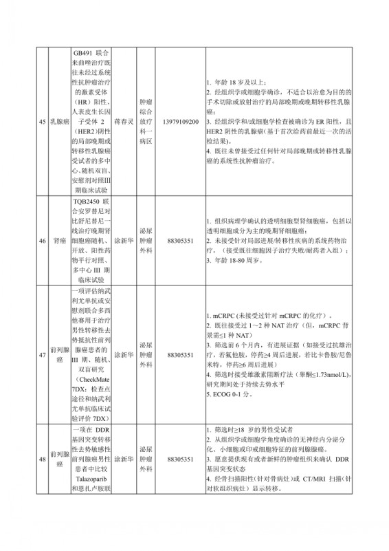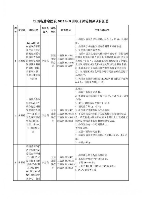 江西省肿瘤医院2022年8月正在招募的临床试验项目信息如下,表格中仅列举主要入选标准,如您有意向参加,请联系对应科室或病区研究医生,他(她)会向您详细介绍试验信息并初步判断您是否符合入选标准。在获得您的充分知情同意后,会进行严格筛选,看是否符合入选标准及不符合排除标准。如筛选成功,注册类临床试验项目使用的试验用药物、产生的相关检查检验费用及交通补助由申办者承担;如筛选失败,也不会受到任何不利影响,会根据您的病情建议或给予常规标准治疗,筛选期的相关检查检验费用由申办者承担。对于您的个人信息将遵照国家相关法规要求进行保密。