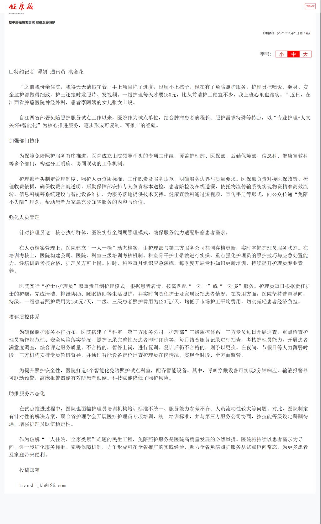 自江西省部署免陪照护服务试点工作以来,医院作为试点单位,结合肿瘤患者病程长、照护需求特殊等特点,以“专业护理+人文关怀+智能化”为核心推进服务,逐步形成可复制、可推广的经验。