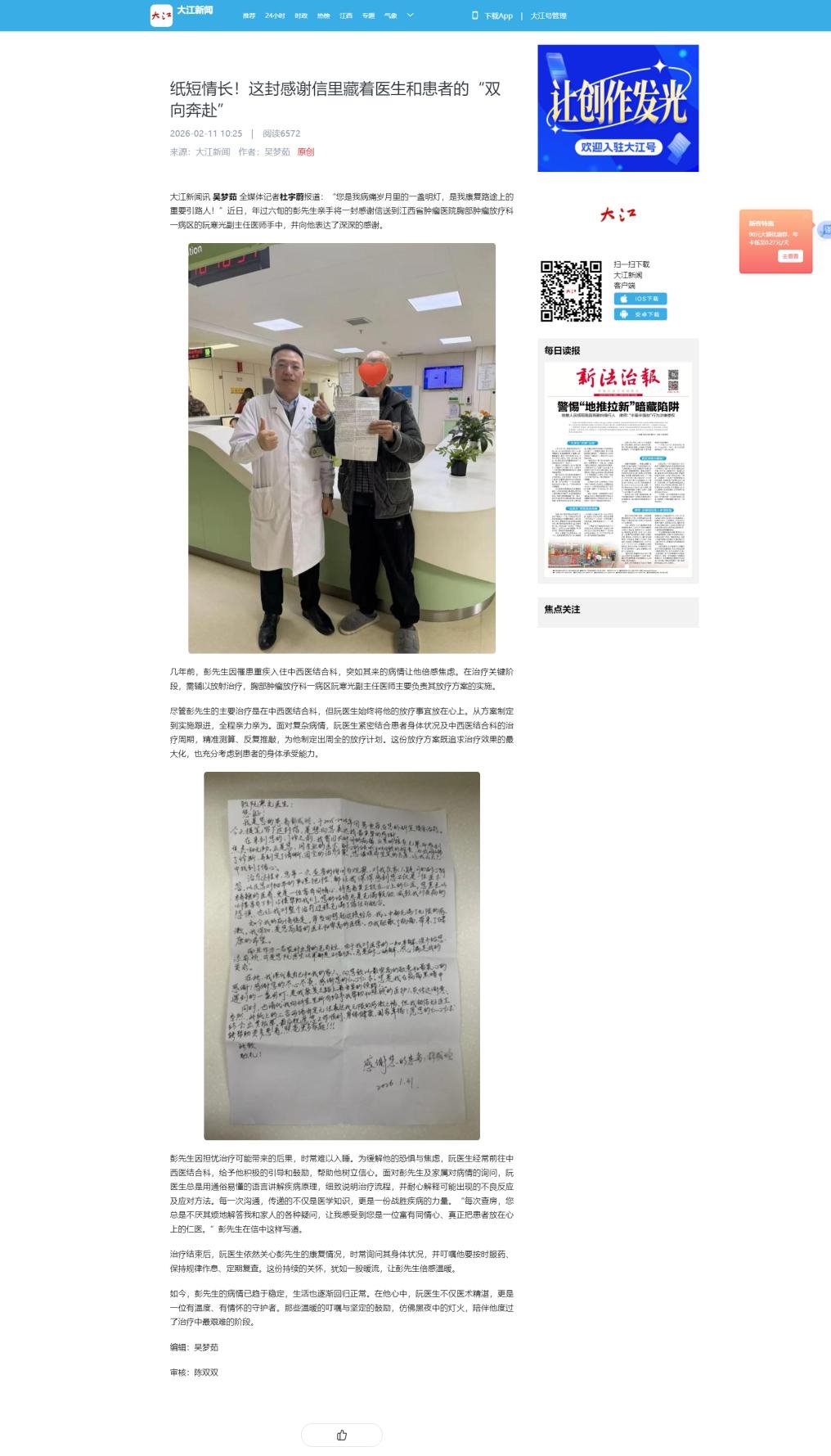 大江新闻讯吴梦茹全媒体记者杜宇蔚报道:“您是我病痛岁月里的一盏明灯,是我康复路途上的重要引路人!”近日,年过六旬的彭先生亲手将一封感谢信送到江西省肿瘤医院胸部肿瘤放疗科一病区的阮寒光副主任医师手中,并向他表达了深深的感谢。