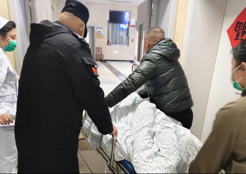 保安班长迅速统筹现场处置,第一时间通过对讲机调度,安排就近保安员从抽血处紧急推来平车。随后,在场的保安员与急诊科护士紧密配合、协同作战,大家小心翼翼地抬起晕倒职工,平稳地将其转移至平车上。