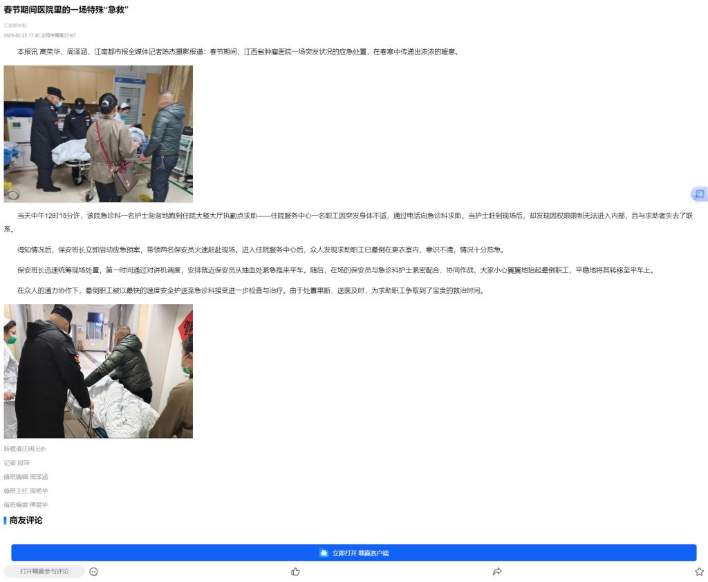 本报讯 高荣华、周泽涵、江南都市报全媒体记者陈杰摄影报道:春节期间,江西省肿瘤医院一场突发状况的应急处置,在春寒中传递出浓浓的暖意。