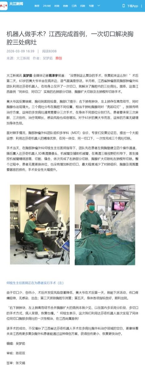 该手术的成功,不仅填补了江西省达芬奇机器人手术在多病灶胸外科治疗领域的空白,更意味着未来江西有更多复杂胸外科患者能通过这种微创方案,获得创伤更小、恢复更快治疗。