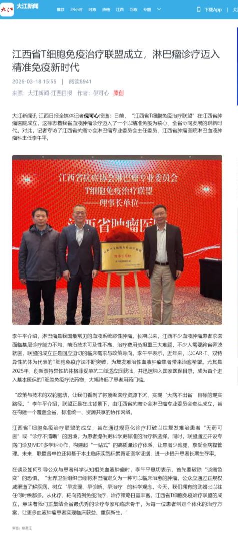 大江新闻讯 江西日报全媒体记者倪可心报道:日前,“江西省T细胞免疫治疗联盟”在江西省肿瘤医院成立,这标志着我省血液肿瘤诊疗迈入了一个以精准免疫为核心、全省协同发展的崭新时代。对此,记者专访了江西省抗癌协会淋巴瘤专业委员会主任委员、江西省肿瘤医院淋巴血液肿瘤科主任李午平。