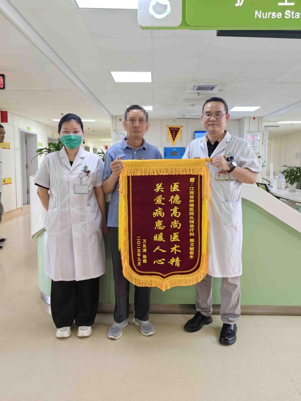 (郑菲菲报道)“真是太感谢你们了!不仅治好了我的病,还一直记挂着我的恢复情况。”近日,患者张先生专程带着一面“医德高尚医术精,关爱病患暖人心”的锦旗,来到江西省肿瘤医院头放一病区,亲手送到熊文敏医生手中,表达康复后的感激之情。