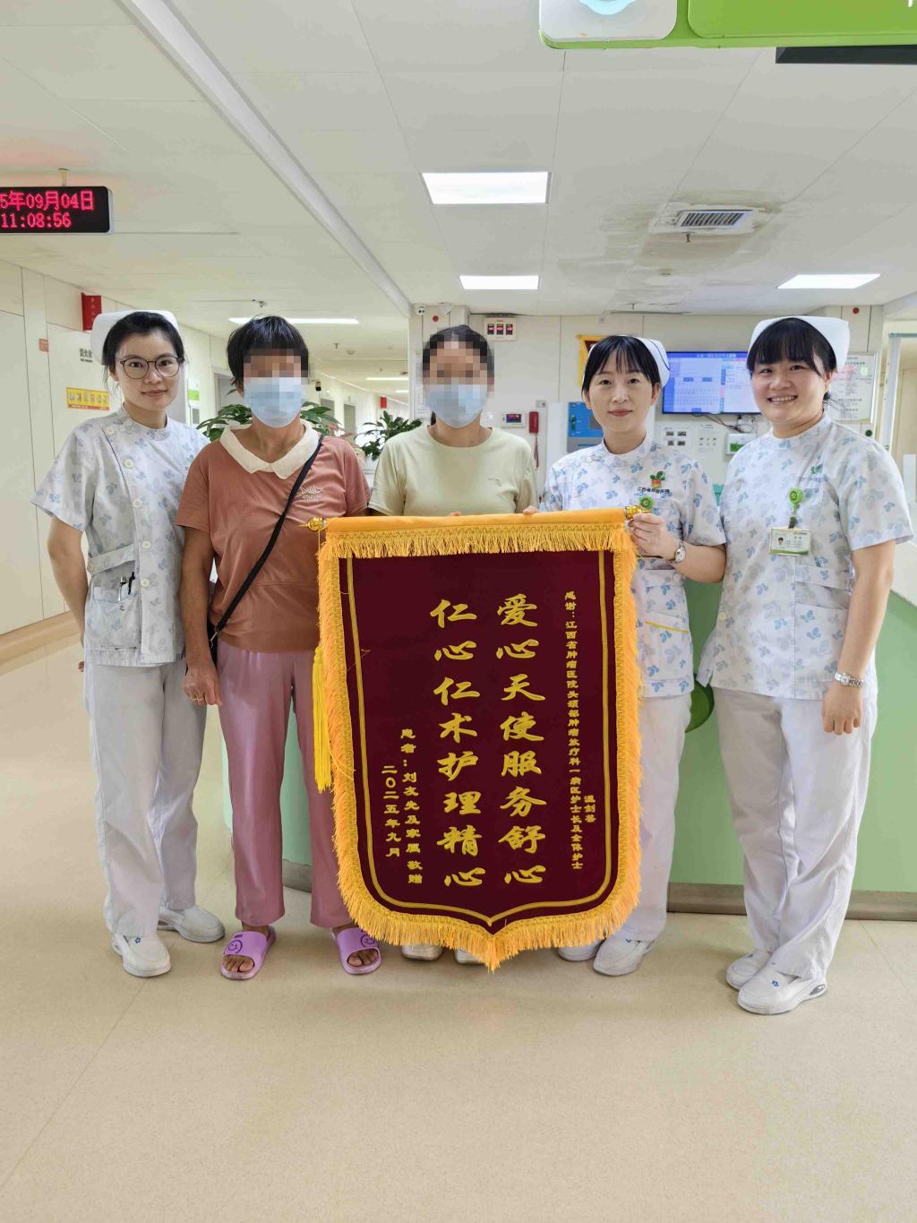(林萍报道)近日,江西省肿瘤医院头放一病区收到患者刘叔叔及家属送来的一面“爱心天使服务舒心,仁心仁术护理精心”锦旗,表达对温剑芸护士长和全体护理团队专业照顾与贴心服务的由衷感谢。