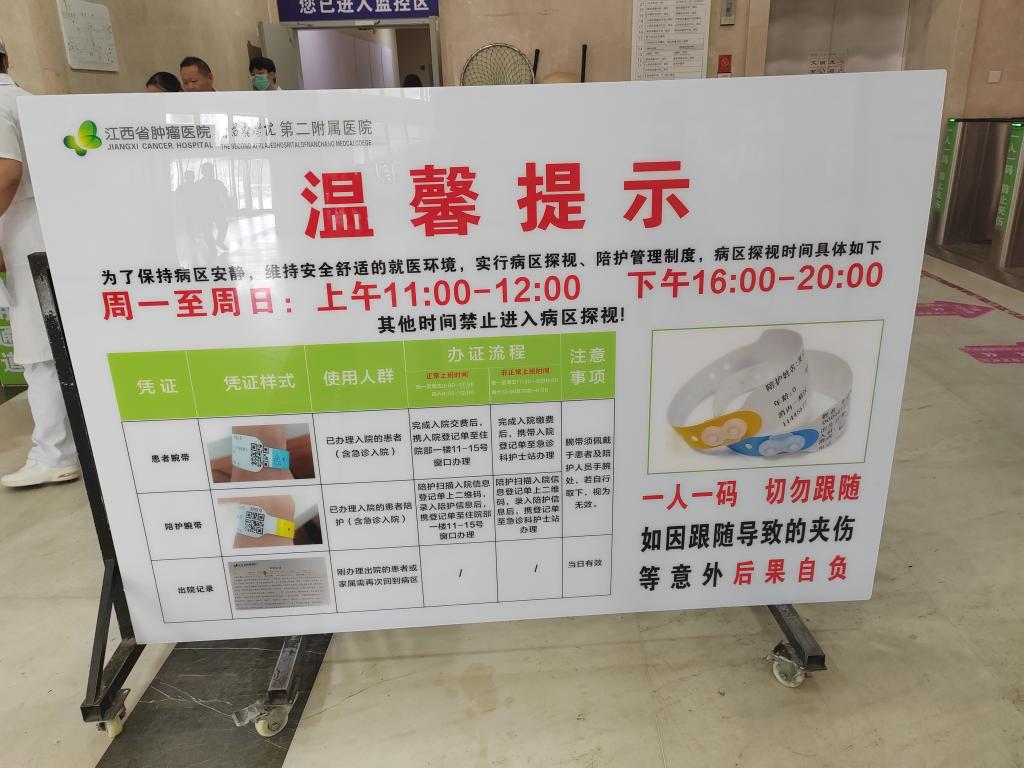 (兰娟萍报道)近日,江西省肿瘤医院一站式服务中心制定了温馨提示牌,明确规定了探视时间和打印腕带相关事项,方便患者及家属了解。