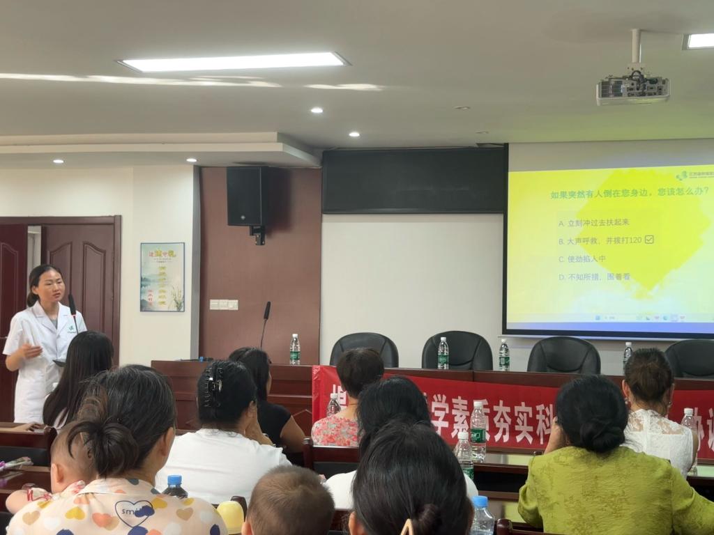 最后,施春女护士在本次健康科普活动中为社区居民科普了“救在眼前——心肺复苏这样做”。她以一个视频和发人深省的问题开场,瞬间激发了大家学习急救知识的迫切感。图文并茂的讲解,使“黄金四分钟”“胸外按压”和“AED”这些专业术语变得清晰具体。在黄诚护士长的指导下,大家轮流上前在模拟人身上进行心肺复苏实践。“阿姨,您的力度不够,要再用力一些”“手臂不要弯曲,用上身的力量”“节奏对了,很棒!”虽然居民们动作略显生疏,但每个人都学得非常认真。