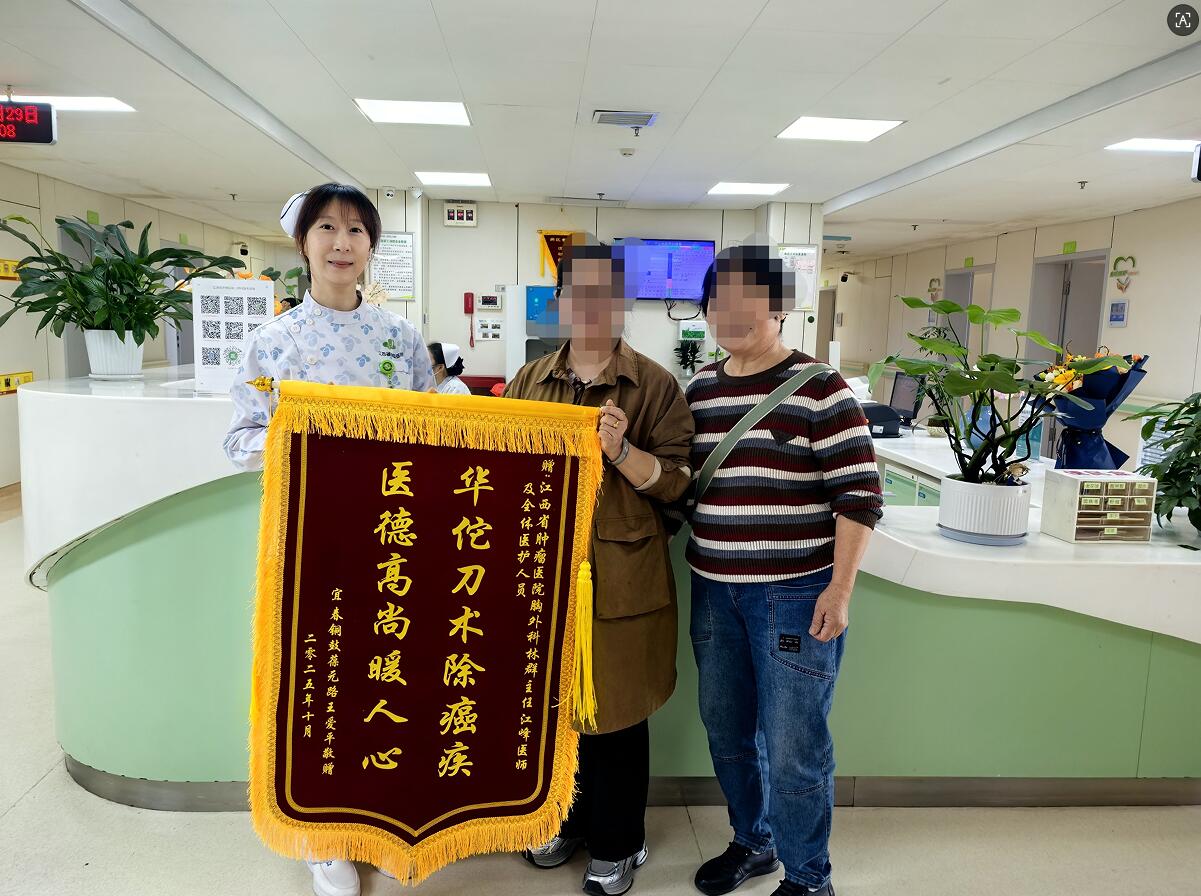 (王礼春报道)“十五年了,要不是当年你们救了我,哪有我现在的好日子!”近日,一位面色红润、精神矍铄的老人来到江西省肿瘤医院胸外三病区,将一面“华佗刀术除癌疾,医德高尚暖人心”的锦旗,郑重地交到科室医护团队手中,言语间满是感激。