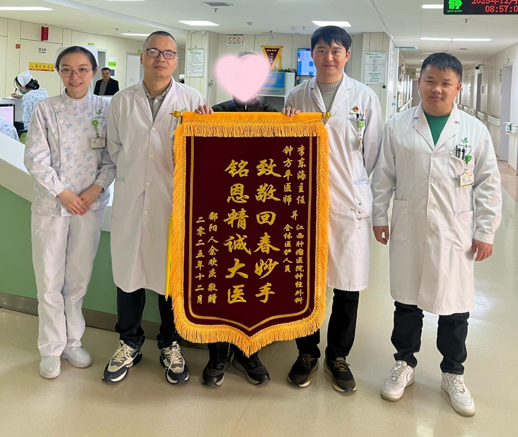 (董莎莎报道)“致敬回春妙手铭恩精诚大医”。12月1日清晨,江西省肿瘤医院神经外科,患者余大叔的父亲将一面烫金锦旗郑重递到医护人员手中。锦旗里裹着的,是一个家庭从“一筹莫展”到“重获希望”的故事。