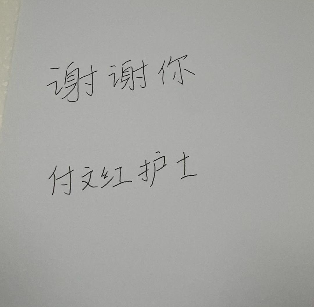 日复一日,在一次次换药与添水的关怀中,曾爷爷顺利完成放疗。出院当日,老人紧握付文红双手,浑浊眼眶泛起泪光,颤抖着另一只手从枕边取出一张纸,上面用歪歪扭扭的字迹写着:“谢谢你,付文红护士”。虽无华丽辞藻,这七个字却胜过千言万语,为整个病房带来浓浓温情。
