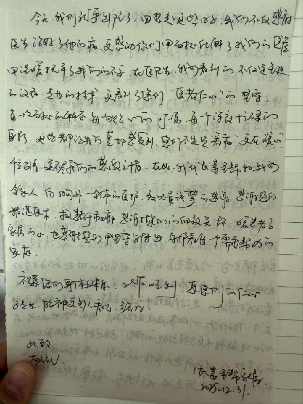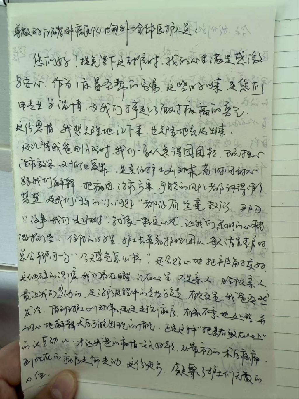 (刘琳菲报道)近日,江西省肿瘤医院胸部肿瘤外科一病区收到一封患者家属的手写感谢信,以感谢该科一病区全体医护人员。