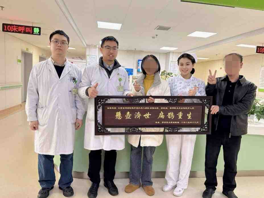 (周意芳报道)近日,江西省肿瘤医院肝胆二病区涂强主任团队收到一面雕刻精美的牌匾,上书“悬壶济世、扁鹊重生”八个大字,格外醒目。