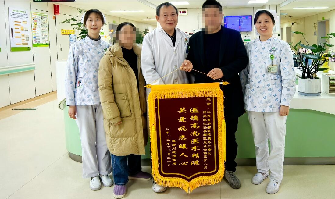 (吴小丹报道)冬日的江西省肿瘤医院胸外科病房暖意融融。刚康复出院的刘阿姨将一面印有“医德高尚医术精湛,关爱病患暖人心”的锦旗送到医护团队手中,以最真挚的方式表达感激。