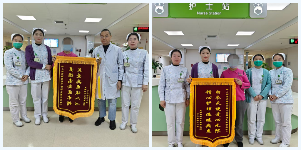 康复出院时,刘女士及家属将一面“医德高尚医术精,关爱病患暖人心”的锦旗赠予郑子雯主任及医生团队,另一面“白衣天使爱心无限,精心护理温暖病患”的锦旗赠予护理团队。两面锦旗承载着患者对医护工作的高度认可,见证医患间的信任与真情。
