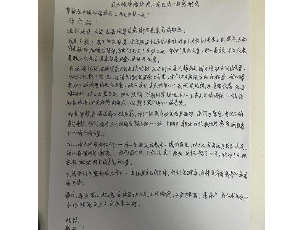 (洪丽利报道)1月16日下午,江西省肿瘤医院头颈肿瘤放疗科二病区收到一封满含深情的感谢信。字里行间,满溢着对该病区医护团队精湛医术与暖心护理的由衷感激。