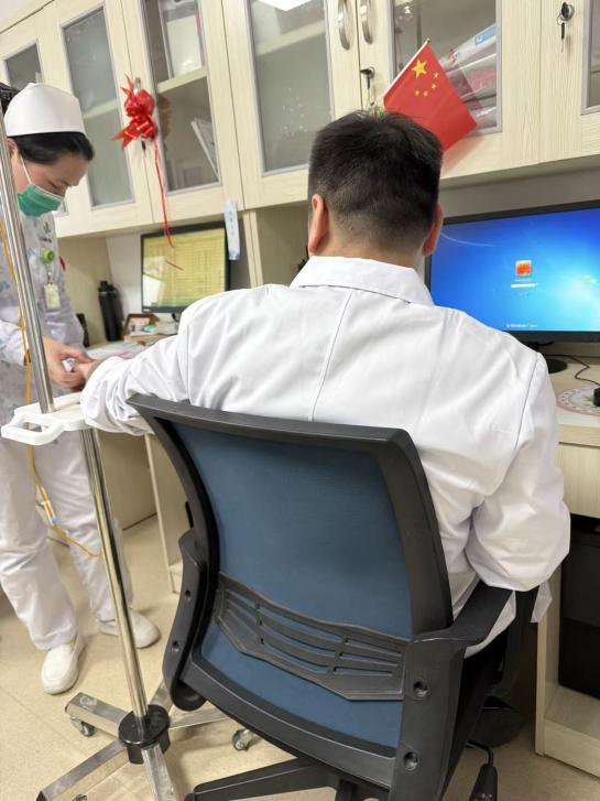 过了一会儿,徐医生咳嗽加剧,头也阵阵作痛,因高烧导致时不时发虚汗的他,却依然坐在工位,为病痛中的患者调整用药方案。