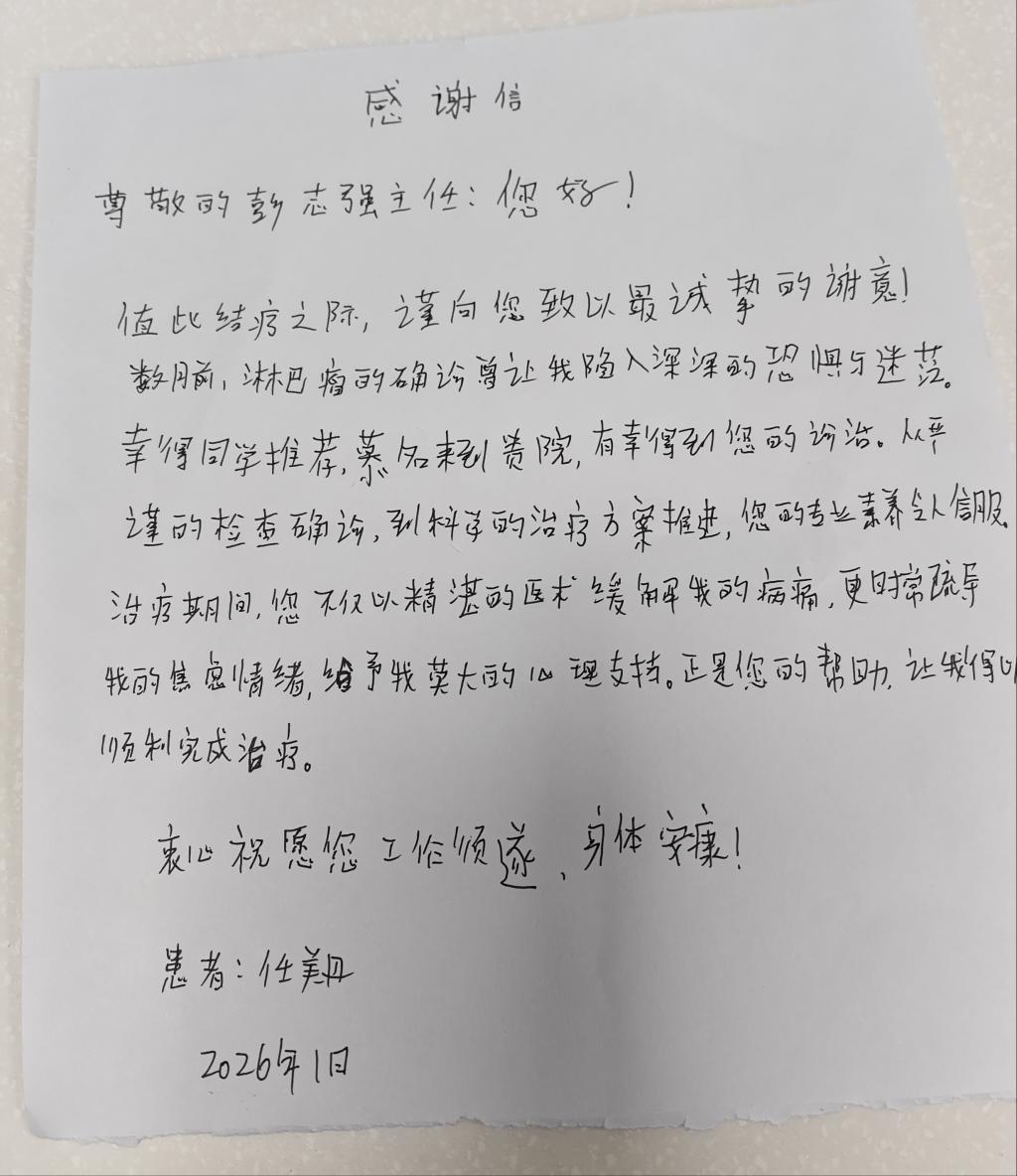 (赖慧闽报道)1月21日,江西省肿瘤医院淋巴血液肿瘤科二病区收到了一封饱含深情的患者手写感谢信!任阿姨在几个月前因突发高热、咳嗽、乏力等症状紧急就诊,经过详细检查后被确诊为高危组急性髓细胞白血病,同时合并严重的肺部感染,病情一度十分危急。在医务人员的积极救治下,经过多轮化疗、抗感染治疗以及精心护理,任阿姨的身体状况逐渐好转,近期终于转危为安。