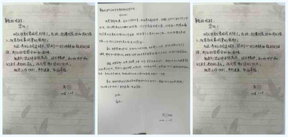 三封手写感谢信,笔墨虽浅,情意却浓。它们不仅是患者对医护人员专业素养与服务态度的认可,更是医患之间彼此信任、相互温暖的缩影。骨软科医护团队将继续秉持初心,用专业与爱心为患者的健康保驾护航。