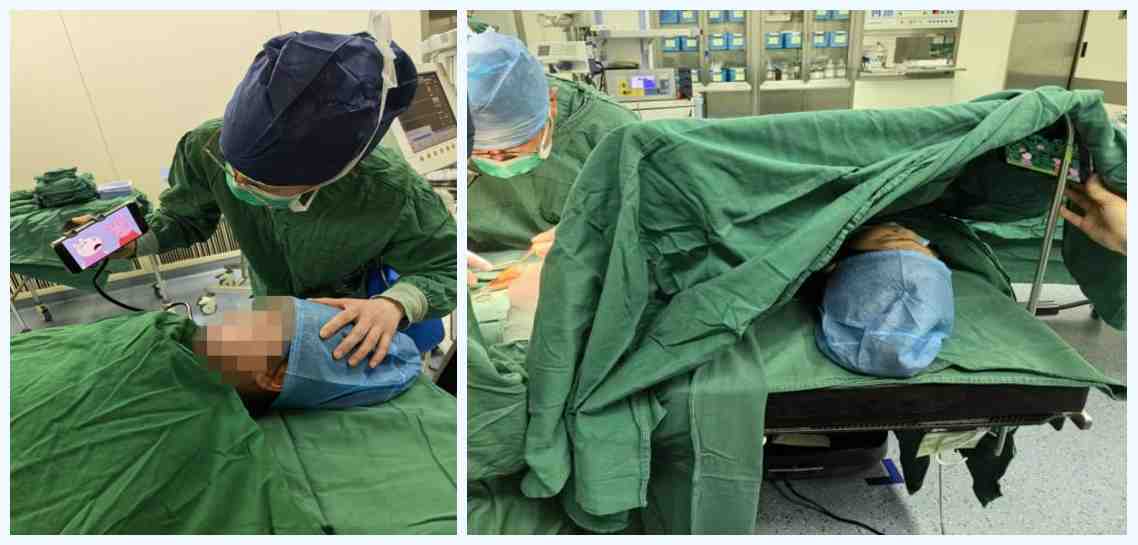 手术过程中,袁佳佳医生始终站在淼淼头侧,轻声与她交流动画片内容,不时抚摸她的额头。淼淼的左手食指被无菌单覆盖,完全看不出正在进行手术,而她的大眼睛则专注地盯着手机屏幕。