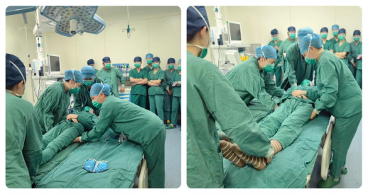 演练进入重要环节——模拟术中突发情况。手术结束,巡回护士涂莉莉准备帮患者过床时,发现“患者”骶尾部出现2cm×3cm压红,压之不退色,皮肤完整无破损,判断为I期压力性损伤。她立即启动应急预案:立刻报告护长,马上取泡沫敷料贴,无张力贴敷于骶尾部压红处,固定防止卷边;同时,告诉医生和麻醉医生过床时避免拖拽,在转运床上位于患者肩背部、骶尾部放置凝胶减压垫。并上报不良事件,通知科室不良事件管理小组组织讨论。整个流程有条不紊,团队成员间沟通高效、配合默契。