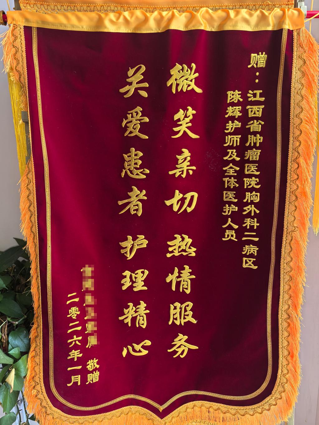 (张霞、王伟报道)近日,江西省肿瘤医院胸部肿瘤外科二病区护士站内暖意融融,患者言大叔的家属专程来到科室,将一面绣有“微笑亲切,热情服务,关爱患者,护理精心”的锦旗,郑重地送到护士长手中,以此向悉心照料言大叔的护士陈辉表达最诚挚的谢意。这面锦旗不仅是对护士个人专业护理的高度赞誉,更是对胸部肿瘤外科二病区护理团队整体服务质量的充分肯定。