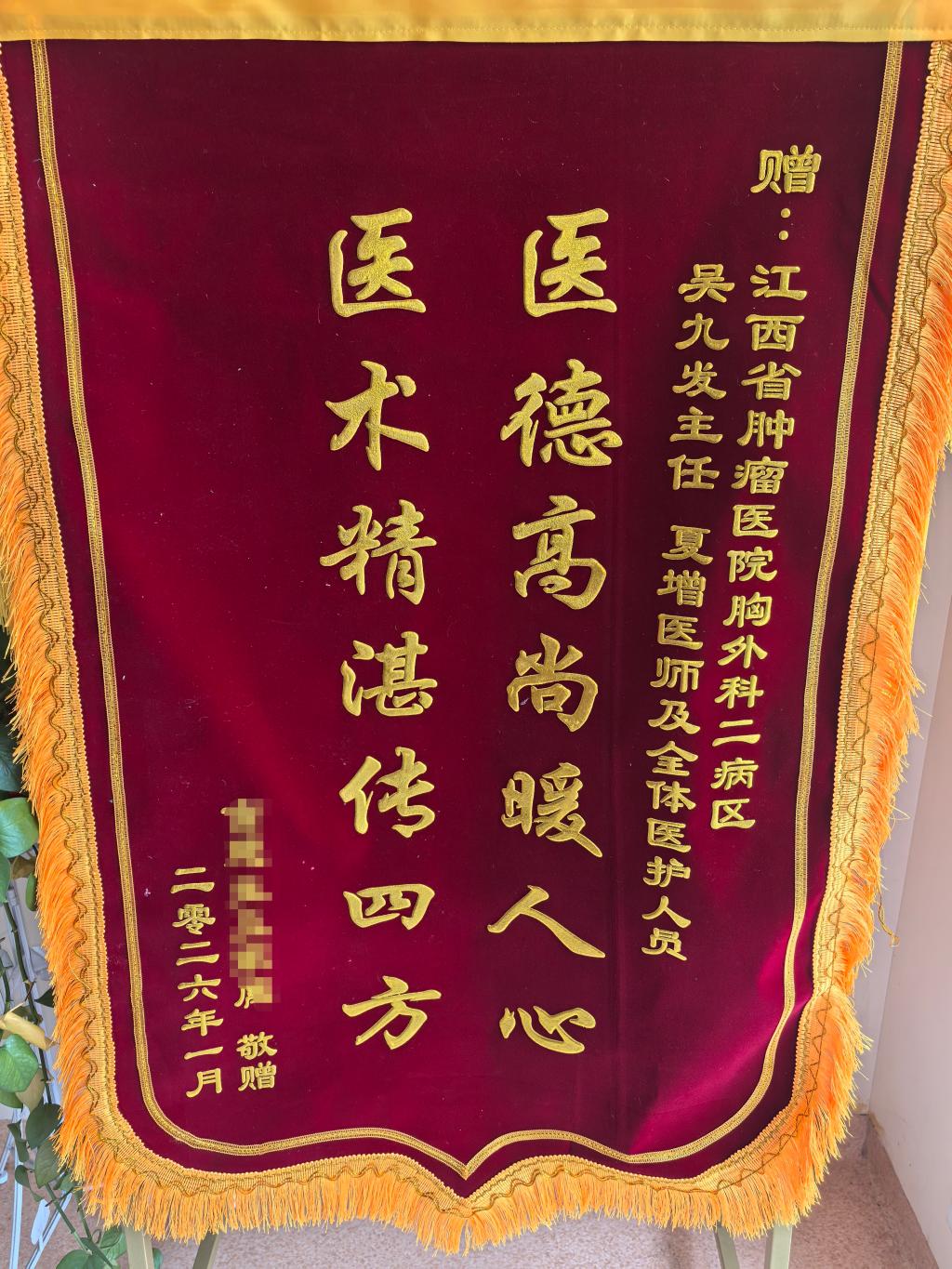 出院后一周,言大叔的家属专程回到胸部肿瘤外科二病区,将一面鲜红的锦旗送到了吴九发主任医师团队手中。锦旗上“医德高尚暖人心,医术精湛传四方”的金色大字格外醒目,这是患者和家属对医护团队最真挚的感谢。“从意外发现病变时的恐慌,到治疗过程中的安心,再到康复出院时的喜悦,这一切都离不开胸部肿瘤外科二病区医护人员的专业和关怀。”言大叔的家属激动地说,“特别是吴九发主任医师团队的精湛技术,还有护士们的细心照顾,让我们全家人都很感动。”