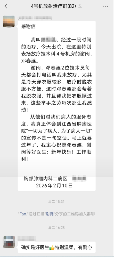 这位年过七旬的患者,一年前因肺癌接受放疗,今年因胸椎转移再次入院。冬日里南昌的湿冷,对体弱的老人而言本就难熬,放疗时穿脱厚重的衣物更成负担。于是,4号机房有了不成文的默契:谢闽、邓春涟每天主动致电患者,提醒放疗时段;老人进机房时,邓春涟总会迎上前,细心帮着脱外套,把衣袖轻轻顺好,再扶上治疗床。日复一日,这些“顺手帮一把”的动作,老人看在眼里,暖在心头。