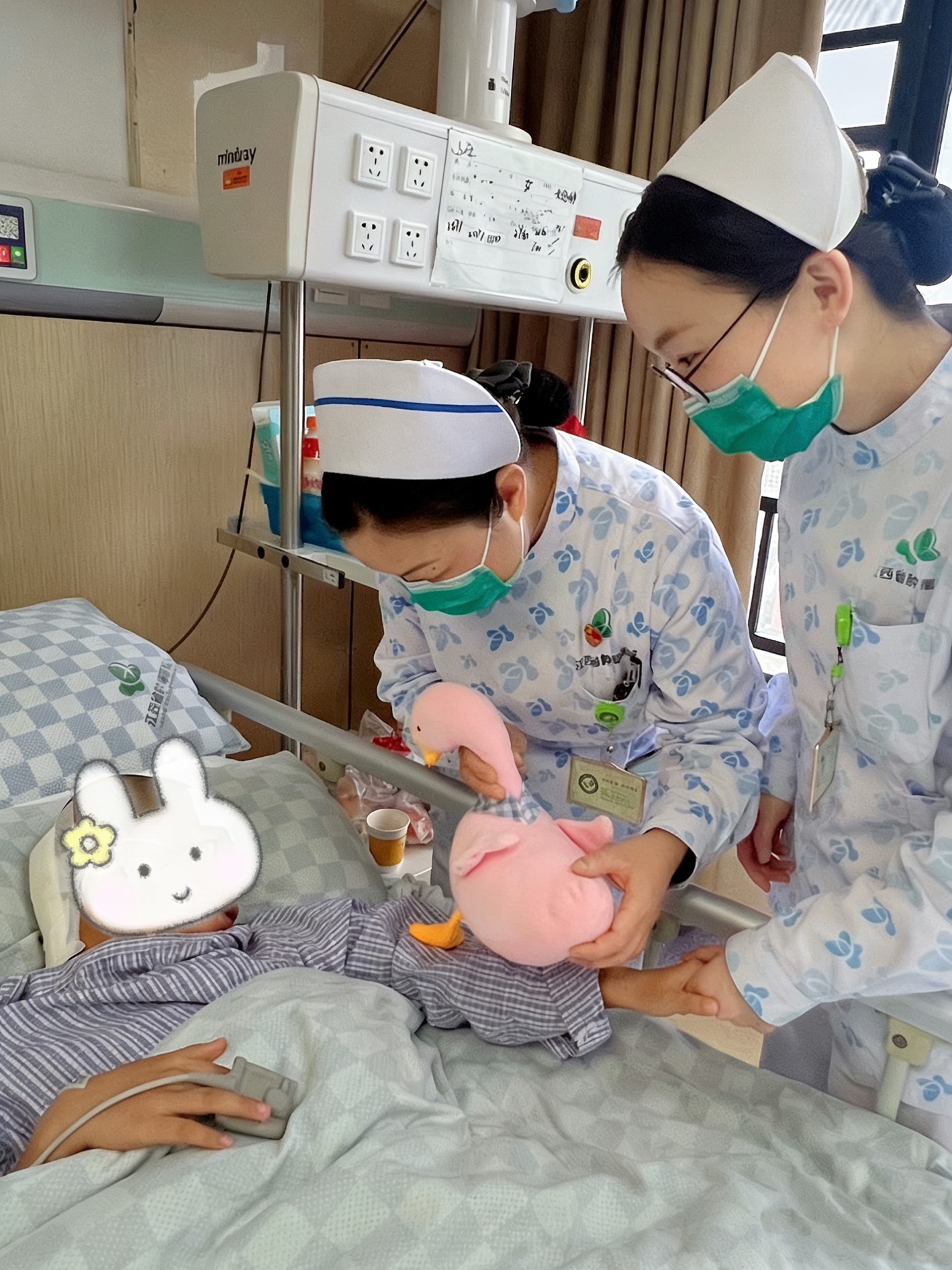 值班护士黄双灵发现后,一边安抚孩子,一边向护士长张巧蓉汇报。得知淼淼因思念父母而难过,张巧蓉专程从家里带来一只精心挑选的小鸭子玩偶,轻轻放在孩子枕边:“淼淼乖,爸爸妈妈很快就会来看你。这只小鸭子会一直陪着你睡觉、陪着你康复,就像爸爸妈妈在身边一样。”