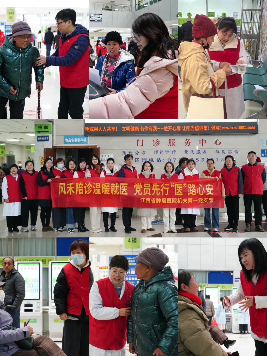 为强化党员服务意识,推动“以患者为中心”理念落地生根,2026年1月27日,江西省肿瘤医院机关第一党支部组织全体党员,在医院门诊大厅开展“风禾陪诊温暖就医 党员先行‘医’路心安”主题党日活动。通过党员志愿服务,提升患者就医体验,展现机关党员主动服务临床、贴心服务患者的良好风貌。
