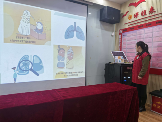 支部志愿者现场开展科普讲堂,围绕结核病传播途径、临床症状、预防治疗等核心知识进行细致讲解,同时普及肿瘤防治、日常健康养生等内容,为居民筑牢健康知识防线。