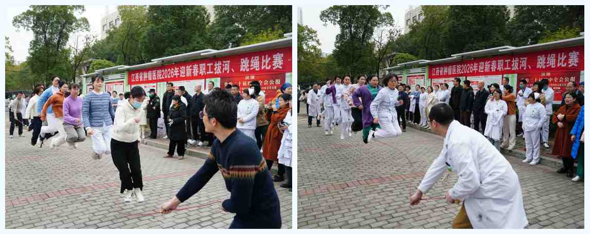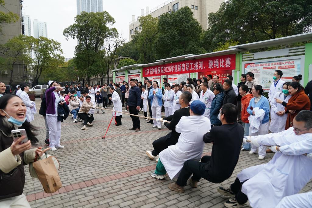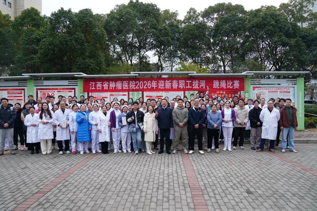 (吴红红报道 梁谦摄影)为深入实施全民健身国家战略,在全院干部职工中推行健康生活理念,缓解工作压力、凝聚团队向心力,1月29日下午,江西省肿瘤医院工会举办“健康生活·绳舞飞扬”迎新春集体跳绳比赛和“健康生活·拔出精彩”迎新春拔河比赛。院党委委员、纪委书记李焜亲临现场,为参赛队伍加油助威,并为获奖队伍颁奖。
